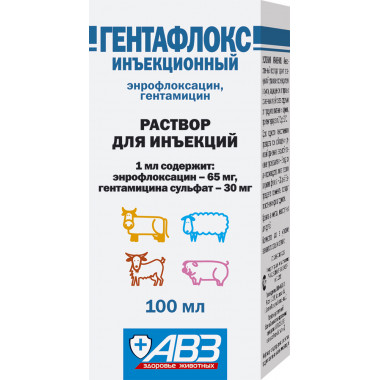 Преимущества Комбинированный антибактериальный лекарственный препарат активный в отношении большинства бактериальных инфекций животных. Сочетание действий двух антибиотиков различных групп снижает риск возникновения резистентных форм патологических микроорганизмов. Удобная инъекционная форма. Состав и фармакологические свойства. "Гентафлокс инъекционный" в качестве действующих веществ в 1 мл содержит энрофлоксацин - 65 мг и гентамицина сульфат - 30 мг, а также вспомогательные вещества. "Гентафлокс инъекционный" относится к группе комбинированных антибактериальных лекарственных препаратов. Энрофлоксацин - соединение из группы фторхинолонов, активно в отношении большинства грамположительных и грамотрицательных бактерий, в том числе Pseudomonas aeruginosa, Klebsiella spp., Escherichia coli, Enterobacter spp., Campylobacter spp., Shigella spp., Haemophilus spp., Salmonella spp., Aeromonas spp., Proteus mirabilis, Staphylococcus spp., а также Mycoplasma spp., Chlamydia spp. Механизм бактерицидного действия энрофлоксацина заключается в ингибировании бактериальной ДНК-гиразы. При парентеральном введении энрофлоксацин легко всасывается из места инъекции и проникает в большинство органов и тканей организма животных, достигая максимальной концентрации в крови через 0,5-1 час после введения препарата, терапевтическая концентрация поддерживается на протяжении 24 часов. Энрофлоксацин частично метаболизируется в печени с образованием активного метаболита ципрофлоксацина, выводится из организма в основном с мочой и желчью, у лактирующих самок также с молоком. Гентамицина сульфат - антибиотик из группы аминогликозидов, активен в отношении большинства грамположительных и грамотрицательных бактерий, включая Streptococcus spp., Staphylococcus spp., Escherichia coli, Proteus spp., Enterobacter spp., Klebsiella pneumonia, Shigella spp., Pseudomonas aeruginosa, Clostridium spp., Treponema hyodysenteriae, Corynebacterium spp. Механизм бактерицидного действия гентамицина заключается в подавлении синтеза белка в микробной клетке на рибосомальном уровне. При парентеральном введении гентамицин быстро всасывается из места инъекции и распределяется в большинстве органов и тканей организма животных, достигая максимальных концентраций через 0,5-1 час после введения. Выводится из организма преимущественно в неизмененном виде с мочой. Порядок применения. "Гентафлокс инъекционный" применяют животным один раз в сутки в дозе 0,5 мл на 10 кг массы животного: свиньям внутримышечно в течение 3-7 дней, свиноматкам при синдроме метрит-мастит-агалактия - в течение 1-2 дней; овцам, козам и телятам подкожно в течение 3-5 дней. В связи с возможной болевой реакцией не следует вводить в одно место овцам, козам, телятам и свиньям более 5 мл, поросятам - более 2,5 мл лекарственного средства.