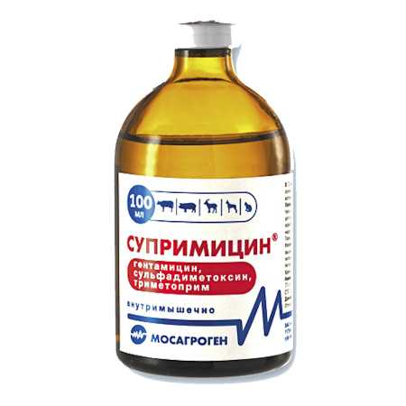ОБЩИЕ СВЕДЕНИЯ 1. Супримицин® (Suprimycin) –лекарственное средство, содержащее в 1 мл раствора гентамицина 20 мг, сульфадиметоксина 200 мг, триметоприма 40 мг, вспомогательные вещества и воду для инъекций. 2. Препарат представляет собой прозрачную жидкость бледно-желтого цвета. 3. Препарат выпускают в форме раствора для инъекций, расфасованным по 20 или 100 мл в стеклянные флаконы соответствующей вместимости. Флаконы укупоривают резиновыми пробками и укрепляют алюминиевыми колпачками. Хранят препарат в сухом, защищенном от света месте при температуре от 5 С до 25 С. Срок годности при соблюдении условий хранения - 2 года со дня изготовления. Запрещается использовать Супримицин® по истечении срока его годности. ФАРМАКОЛОГИЧЕСКИЕ СВОЙСТВА 4. Антимикробное действие Супримицина® обусловлено входящими в его состав компонентами: гентамицином, сульфадиметоксином и триметопримом. Гентамицин, принадлежащий к группе аминогликозидов, оказывает бактерицидное действие на грамотрицательные микроорганизмы и аэробные грамположительные кокки. Антимикробный спектр препарата расширен за счёт действия сульфаниламида и триметоприма направленного на грамположительные и грамотрицательные кокки и большую часть грамотрицательных бацилл. 5. Препарат по степени воздействия на организм теплокровных животных относится к веществам умеренно опасным (3 класс опасности по ГОСТ 12.1.007-76). ПОРЯДОК ПРИМЕНЕНИЯ 6. Препарат применяют крупному и мелкому рогатому скоту, свиньям, собакам и кошкам при бактериальных инфекциях дыхательных путей (пневмонии, бронхопневмонии, бронхите), диарее, дизентерии, колибациллёзе, энтерите септицемии, метритах и эндометритах, маститах, паротитах, пиелите, пиелонефрите, цистите, уретрите, пастереллёзе, кожных инфекциях, актиномикозах, гнойных абсцессах, злокачественном отёке. 7. Препарат вводят внутримышечно из расчёта 1 мл на 10 кг массы тела животного каждые 12-24 ч в течение 3-5 дней, но не более: * крупный рогатый скот - 40 мл; * свиноматки и молодняк крупного рогатого скота - 20 мл; * поросята, овцы, телята - 10 мл; * поросята (5-8 недель) - 2-3 мл; * поросята (3-5 недель ) ягнята , собаки - 1-2 мл; * поросята (0-3 недели), кошки - 0,5-1 мл. 8. В особых случаях, по рекомендации ветеринарного врача, длительность лечения можно увеличить до 7 и более дней. 9. Не рекомендуется применять препарат животным с почечной недостаточностью и самкам во вторую половину беременности. 10. У отдельных животных может возникать раздражение на месте введения препарата. В случае побочных реакций или анафилактического шока необходимо применять адреналин и антигистаминные препараты в соответствие с их инструкциями по применению. 11. Убой животных на мясо разрешается не ранее, чем через 30 дней после прекращения применения препарата. Мясо животных, вынужденно убитых до истечения указанного срока, может быть использовано для кормления пушных зверей после термической обработки. 12. Запрещается использовать для пищевых целей молоко, полученное от животных в период лечения Супримицином® и в течение 4 суток после прекращения применения препарата. Такое молоко может быть использовано для кормления животных после термической обработки. МЕРЫ ПРЕДОСТОРОЖНОСТИ 13. При работе с Супримицином® следует соблюдать общие правила личной гигиены и техники безопасности, предусмотренные при работе с лекарс