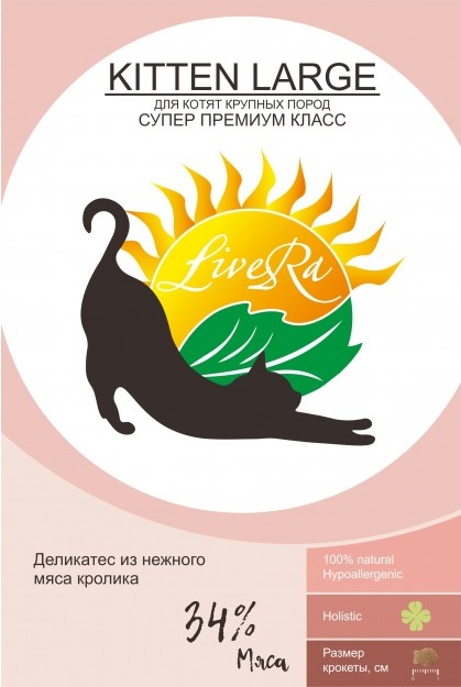 LiveRa KITTEN LARGE – Деликатес из нежного мяса кролика. Корм для котят крупных пород и кормящих кошек LiveRa – сбалансированный рацион на основе мяса индейки и кролика, содержащий в себе оптимальное сочетание жиров, всех необходимых витаминов и минералов, который позволит обеспечить Вашему питомцу долгую здоровую активную жизнь и прекрасную физическую форму на длительное время. Состав корма способствует сохранению эластичности кожи и приданию блеска шерсти, повышает иммунитет, сохраняет зрение, обеспечивает здоровый опорно-двигательный аппарат, стабилизирует работу пищеварительной системы, улучшает работу мочеполовой системы. Специальный размер гранул предотвращает слишком быстрое поглощение корма, которое может привести к проблемам с пищеварением. Также в процессе разгрызания особая структура гранул способствует укреплению зубов и десен и их механической чистке. Поэтому корм лучше давать животному сухим и следить при этом, чтобы постоянно была свежая вода в свободном доступе. Содержание витаминов гарантировано до истечения срока годности. Сохранено натуральными консервантами: Розмарин, витамин С и Е и натуральная смесь токоферолов. Переводить животное стоит в течении недели, постепенно добавляя новый корм в привычную еду животного. Рекомендовано для беременных и кормящих кошек Энергетическая ценность на 100 гр: 406 ккал/1700 к/Дж Состав корма Дегидратированное мясо индейки 26%, дегитратированное мясо кролика 8%), рис (15%), кукуруза, жир индейки, сублимированная печень, масло кукурузное, пульпа сахарной свеклы (источник ФОС), дрожжи ( источник МОС), пробиотики ( Bacillus subtilis и Bacillus lichenitormis ), витаминно-минеральный комплекс, яйцо, морковь (источник лютеина), семя льна , таурин, глюкозамина гидрохлорид, хондроитина сульфат, D,L-метионин, L-карнитин, экстракт розмарина, экстракт фенхеля, экстракт Юкки Шидигера. экстракт морских водорослей (фукуса) Гарантируемый анализ сырой белок 34% , сырой жир 16% , сырая клетчатка 2,5% , сырая зола 7% , кальций 1.3% , фосфор 0,9% Витамины Витамин А 24000 МЕ/кг , Витамин Д3 2000 МЕ/кг , Витамин Е 110 мг/кг , витамис К 0,20/мг/кг, витамин С 20,00 мг/кг, витамин В1 20,00 мг/кг, витамин В2 6,00 мг/кг, витамин В6 6,00 мг/кг, витамин В12 0,04 мг/кг, никотиновая кислота 60,00 мг/кг, пантотеновая кислота 10,00 мг/кг, фолиевая кислота 2,00 мг/кг, биотин 0,13 мг/кг, холин хлорид 2208,00 мг/кг, бетаин 671,12 мг/кг. Микроэлементы железо 110,00 мг/кг, марганец 15,00 мг/кг, цинк 80,00 мг/кг, медь 10,00 мг/кг, йод 1,50 мг/кг, селен 0,15 мг/кг, калий 2,08г/кг, D,L-метионин 1000 мг/кг, L-карнитин 250 мг/кг, таурин 1000 мг/кг, глюкозамина гидрохлорид 300 мг/кг, хондроитина сульфат 200 мг/кг