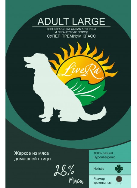 LiveRa ADULT LARGE – Жаркое из мяса домашней птицы легкоусваиваемый, полноценный рацион для взрослых собак крупных и гигантских пород, в основе которого свежее мясо курицы и индейки. Изготовлен из натуральных компонентов с добавлением необходимых витаминов и минералов. Сбор трав входящий в состав корма улучшает работу желудочно-кишечного тракта, поддерживает иммунитет способствует улучшению качества шерсти и состоянию кожи. Хондроитина сульфат, входящий в состав корма, как естественный компонент соединительной ткани, оказывает противовоспалительное и хондропротекторное действие на костно-хрящевую систему сустава. Также в состав корма входит топинамбур, который является природным источником инулина, пребиотика МОС и пробиотики ( Bacillus subtilis и Bacillus lichenitormis ), оказывают благоприятное действие на органы пищеварения, содержат в своём составе ценные минералы и способствует профилактике заболеваний. Содержание витаминов гарантировано до истечения срока годности Энергетическая ценность на 100 гр. продукта: 395 ккал/1654 кДж Состав корма Дегидратированное мясо домашней птицы(курица 21%, индейка 7%), рис, кукуруза, куринный жир, ячмень, кукурузный глютен, масло кукурузное, сублимированная печень, пульпа сахарной свеклы, яйцо, дрожжи (источник МОС), пробиотики ( Bacillus subtilis и Bacillus lichenitormis ), топинамбур (источник ФОС), экстракт Юкки Шидигера, экстракт розмарина, экстракт фенхеля, экстракт водорослей (фукуса) Гарантируемый анализ Сырой белок 26,0 %, сырой жир 14,0 %, сырая зола 6,5 %, сырая клетчатка 2,5 %, влажность не более 10 %,кальций 1,2 %, фосфор 0,8 % Витамины витамин А 16800 МЕ/кг, витамин D3 1600 МЕ/кг, Витамин Е 160 МЕ/кг, витамин В1 10 мг/кг, В2 16 мг/кг, В6 5 мг/кг, В12 0.08 мг/кг, никотиновая кислота 40мг/кг, пантотеновая кислота 40 мг/кг, фолиевая кислота 4 мг/кг, холин 1920 мг/кг Микроэлементы калий 4,16 г/кг, селен 0,3 мг/кг, железо 200 мг/кг, марганец 30 мг/ кг, цинк 220 мг/кг, медь 20 мг/кг, йод 4 мг/кг, бетаин 583,6 мг/кг, глюкозамина хлорид и хондроитина сульфат 1000 мг/кг