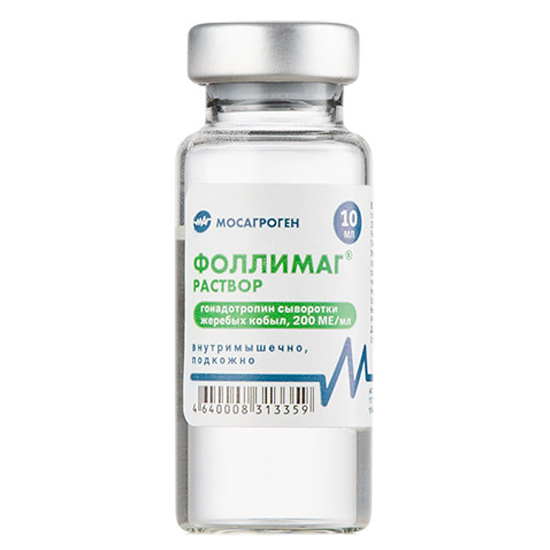 Препарат содержит гонадотропный гормон сыворотки крови жеребых кобыл (ГСЖК), очищенный от иммуногенных белков. ГСЖК обладает как фолликулостимулирующей, так и лютеинизирующей активностью и не обладает межвидовой специфичностью. Фоллимаг стимулирует рост и развитие фолликулов у самок сельскохозяйственных животных, а у самцов усиливает функцию интерстициальных клеток в семенниках, синтез тестостерона и, как следствие, повышение сперматогенеза и половой активности. применяют для стимуляции половой охоты у сельскохозяйственных животных, пушных зверей и лечения гипофункции яичников у коров. Для стимуляции половой охоты и повышения плодовитости препарат вводят однократно: коровам внутримышечно в область бедра в дозах 500-600 МЕ/животное. В случае отсутствия проявления четко выраженной половой охоты или неплодотворного осеменения, препарат следует применить повторно в той же дозе через 21-23 дня после предварительного гинекологического обследования животных; свиноматкам внутримышечно в дозе 500-600 МЕ/животное через 24 часа после отъёма поросят; пушным зверям в период гона подкожно с внутренней стороны бедра в дозе 50 - 60 МЕ/животное. Для лечения гипофункции яичников у коров Фоллимаг применяют внутримышечно в дозе 900-1000 МЕ/животное. С целью повышения половой активности баранов и хряков препарат вводят подкожно с внутренней стороны бедра двукратно с интервалом 3-4 дня в дозе 600-800 МЕ/животное и 1000-1200 МЕ/животное соответственно.