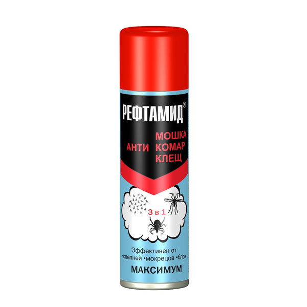 Репеллентное средство от насекомых Рефтамид Максимум 3в1 Против мошек/комаров/клещей аэрозоль 147 мл. Назначение. Средство от насекомых Рефтамид Максимум предназначено для защиты людей от нападения кровососущих насекомых (мошек, комаров, мокрецов, москитов, слепней, блох, лесных и таежных клещей) при нанесении на открытые части тела, одежду, занавеси и другие изделия из ткани. Способ применения. Перед применением баллон встряхнуть. Распылить средство на ладонь и нанести, не втирая, на открытые части тела. Одежду обрабатывать до легкого увлажнения с расстояния 20 — 25 см. Для защиты от клещей обработать весь комплект одежды из расчета 20 сек/кв.м, особенно тщательно — вокруг щиколоток, коленей, бедер, плечевого пояса, манжет и мест возможного проникновения клещей к телу. Время защитного действия: от насекомых при нанесении на кожу — более 4 часов, при нанесении на одежду — до 30 суток; от клещей при нанесении на одежду — до 5 суток. Наносить на кожу не более 1 раза в сутки. Для обработки одежды одному человеку использовать не более 1 баллона в сутки. Повторную обработку проводить не чаще чем через 3 — 5 суток. Средство обеспечивает неполную защиту от клещей. Будьте внимательны! Меры предосторожности. Балон под давлением! Не разбивать и не давать детям. Использовать только по назначению! Не распылять вблизи открытого огня и раскаленных предметов. Предохранять от воздействия прямых солнечных лучей и нагревания выше 40°С. Не курить во время применения. Не наносить на кожу детям, беременным и кормящим женщинам, а также лицам с заболеваниями кожи и повышенной чувствительностью к химическим веществам. Не допускать попадания в органы дыхания, рот, глаза и на поврежденные участки кожи. При попадании в глаза — промыть водой и закапать 30% раствор сульфацила натрия, в рот — прополаскать, в органы дыхания — вывести на свежий воздух. Состав: N,N-Диэтил-3-метилбензамид (ДЭТА) 28%, спирт этиловый денатурированный >30%, бутан/пропан/изобутан смесь >30%, пропиленгликоль <5%, отдушка <5%.