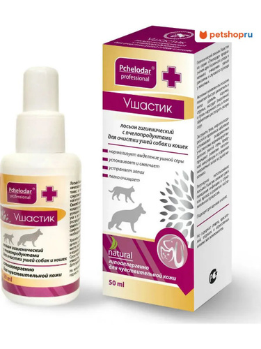 Состав и форма выпуска Раствор для наружного применения. Вода очищенная, пропиленгликоль, цетримониум хлорид, кокамидопропил бетаин, Д-пантенол, динатрий ЭДТА, экстракт прополиса, экстракты трав (арника, розмарин, череда), экстракты морских водорослей (ламинария, фукус), аллантоин, метилхлороизотиазолинон и метилизотиазолинон. Лосьон для ушей выпускают расфасованным по 50 мл во флаконы-капельницы, помещенные вместе с инструкцией по применению в пачки из картона коробочного. Фармакологические свойства Активные компоненты лосьона помогает быстро размягчить и легко удалить корочки, струпья, экссудат (выделения) и грязь наружного уха, а также эффективно растворить ушную серу. Экстракты трав, морских водорослей и прополиса заботливо успокаивают раздраженные участки кожи, нормализуют выделение ушной серы, предупреждают развитие патогенной микрофлоры и устраняют неприятный запах из ушей животного. Регулярное использование лосьона Ушастик снижает риск попадания инфекции в слуховой проход и развития воспалительных процессов. Подходит для щенков и котят. Не содержит спирта, красителей, отдушек и агрессивных химических компонентов. Показания к применению Лосьон применяют для гигиенического ухода за ушами животных, а также в качестве вспомогательного средства при лечении отитов различной этиологии (для санации). Порядок применения Лосьон Ушастик вводят в каждое ухо животного по 5-7 капель из флакона-капельницы, затем массирующими движениями от основания уха к его верхней части равномерно распределяют для растворения ушной серы и загрязнений. Далее лосьон можно удалить из уха с помощью марлевой салфетки или ватного тампона. От остатков лосьона и загрязнений животное может освободиться самостоятельно при встряхивании головой. Лосьон подходит для ежедневного гигиенического ухода или применяется по мере необходимости.