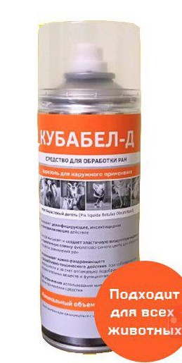 Оказывает дезинфицирующее, инсектицидное, местнораздражающее и ранозаживляющее действие с усиленным антимикробным действием Быстро высыхает и создает эластичную воздухопроницаемую и герметичную пленку фиолетово-синего цвета для стабильного поступления лекарства и ускорения процесса заживления ран. ОТЛИЧИТЕЛЬНЫЕ ОСОБЕННОСТИ «Кубабел-Д» при нанесении на поверхность (кожа, копыто и т.п.) высыхает в течении 2-3 минут и создает эластичную воздухопроницаемую и герметичную пленку фиолетово-синего цвета, со специфическим запахом дегтя. СОСТАВ: берестовый деготь – 20%, анилиновый краситель, растворитель, пленкообразователь, функциональные добавки, пропеллент ВНЕШНИЙ ВИД: однородная непрозрачная жидкость без посторонних включений, темно-фиолетового цвета, со специфическим запахом дегтя ФОРМА ВЫПУСКА: аэрозольные баллоны с распылительными головками и защитными колпачками. Номинальный объем 520 мл Эластичная пленка, в сравнении с обычной техникой перевязок: - ускоряет процесс заживления ран, - способствует стабильному поступлению лекарства, которым обработали рану, - повышает его эффективность, - ускоряет процесс заживления ран. Деготь является одним из лучших природных антисептиков: - защищает повреждения кожи от инфекций, - угнетает распространение бактерий, - ускоряет процесс заживления, - снимает боль, воспаление и отек, - убирает зуд. Оказывает общеукрепляющее действие при оспе. Анилиновый краситель усиливает антимикробное действие дегтя. Он обладает выраженным антисептическим и антибактериальным действием, а также вяжущими свойствами. При нанесении на раны длительно сохраняет активность, подсушивает их, ускоряет процесс заживления. Вспомогательные вещества и функциональные добавки, входящие в состав средства относятся к малоопасным веществам. Благодаря чему средство при соблюдении рекомендаций по применению не раздражает кожу и слизистые оболочки. Противопоказание к применению - повышенная индивидуальная чувствительность животного к его компонентам. «Кубабел-Д» нельзя применять кошкам, животным с мокнущей экземой, а также наносить на открытую раневую поверхность. Животноводческую продукцию после применения средства можно использовать без ограничений.