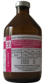 Характеристика Жидкость соломенно-желтого цвета с обильным белым осадком, который при встряхивании флакона легко разбивается, образуя гомогенную взвесь. Вакцина содержит взвесь бактерий Сальмонелла холеесуенс №370, пастерелла мультоцидо №656, стрептококкус фезалис №13, 345, «Соколово», «Константиновский» инактивированных формалином и адсорбированных на гидрате окиси алюминия. Показания к применению Препарат применяют для вакцинации поросят и супоросных свиноматок с профилактической целью в хозяйствах, неблагополучных по сальмонеллезу, пастереллезу и энтерококковвой инфекции. Способ применения и дозы Вакцину применяют в сроки и в дозах, указанных в наставлении. Иммунитет у животных наступает через 10-12 суток после введения второй дозы вакцины и длится не менее 6 месяцев. Форма выпкуска В стеклянных флаконах по 100 — 200 см3. Хранение В сухом тёмном помещении при температуре от + 2 до +15 °С. Срок годности 18 месяцев со дня изготовления.